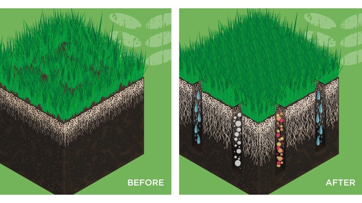 The process of core aeration builds stronger, thicker, greener grass through the next year and can fight off some of the most common lawn problems homeowners experience such as pests, disease, and spotting. Over the course of the spring and summer, your lawn gets more traffic than most other months. The use of machinery and even foot traffic compacts the soil over the course of time, which can start to choke off the grass.